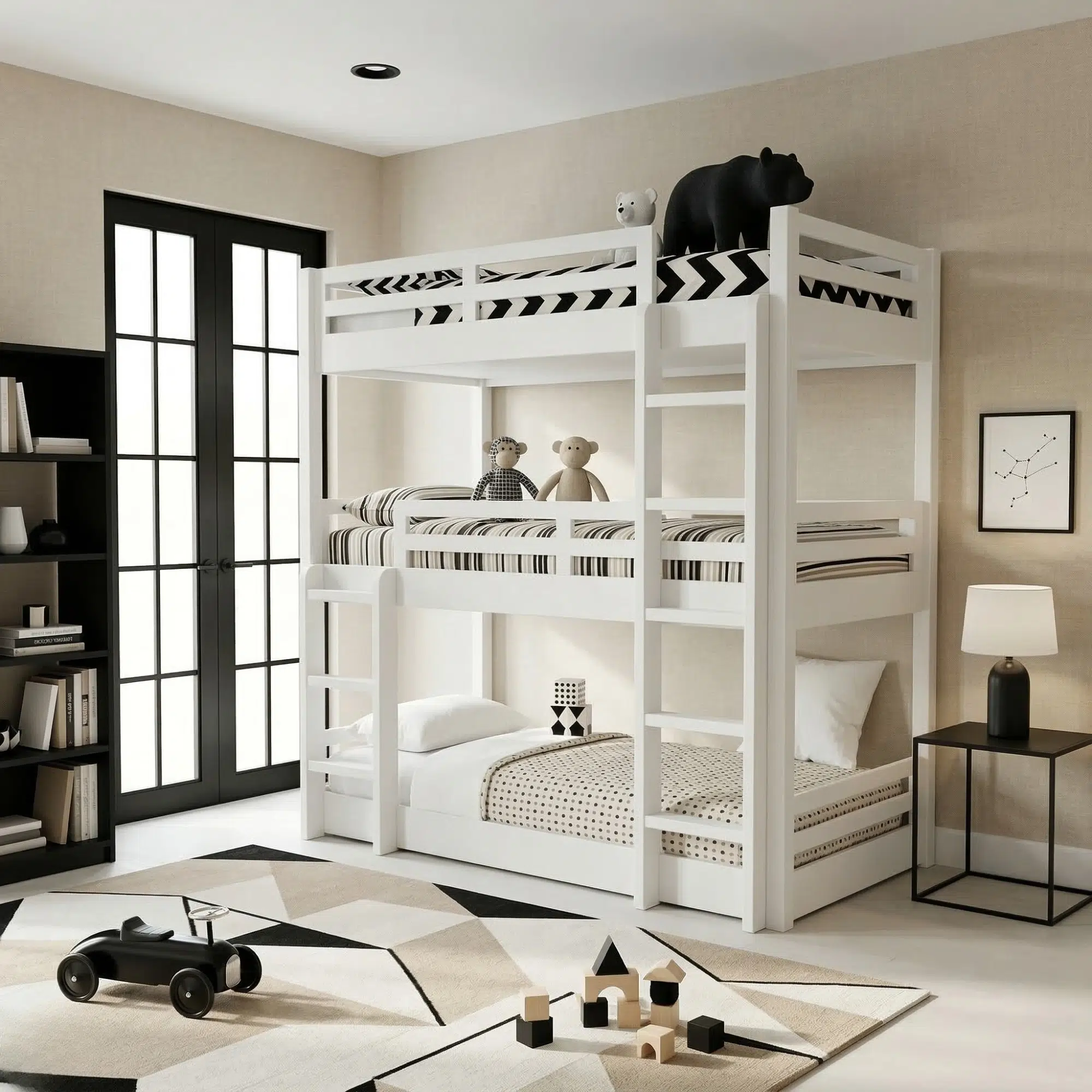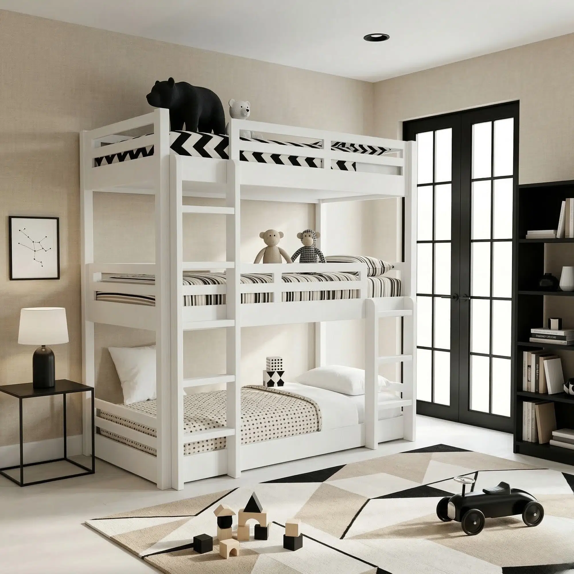 - Design: Space-saving triple bunk structure