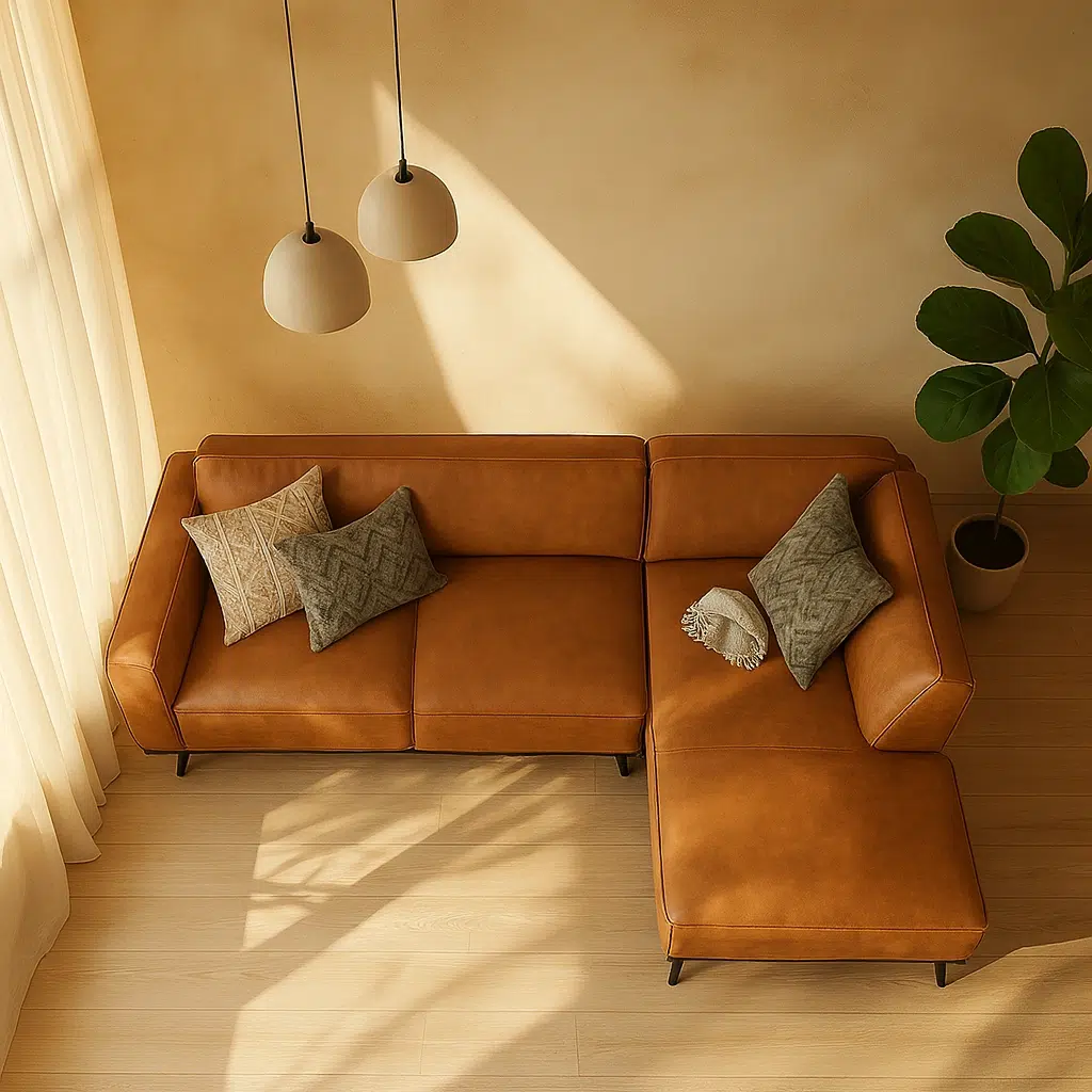 L-shape leather sofa with soft seating, durable wood structure, and a modern industrial look. Fully customizable in any size, color, or fabric.