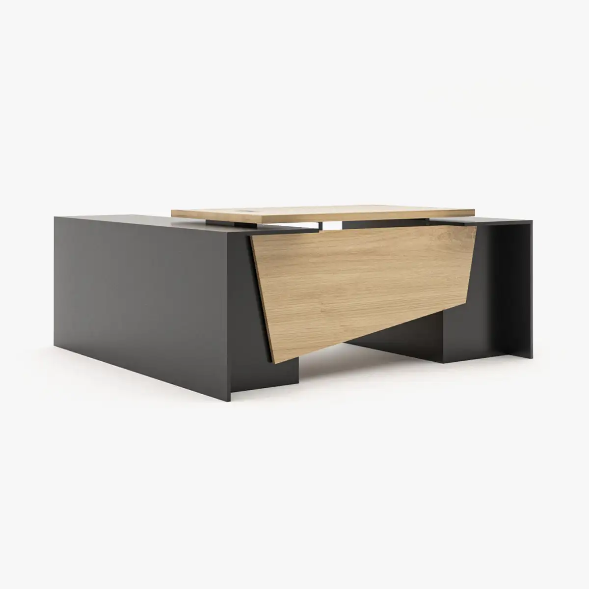 Featuring a sleek matte black frame and a premium light oak finish, the Uplou desk brings a touch of modern sophistication to any room. The uniquely angled front panel adds architectural charm, making this executive desk a standout piece in both home and corporate environments.