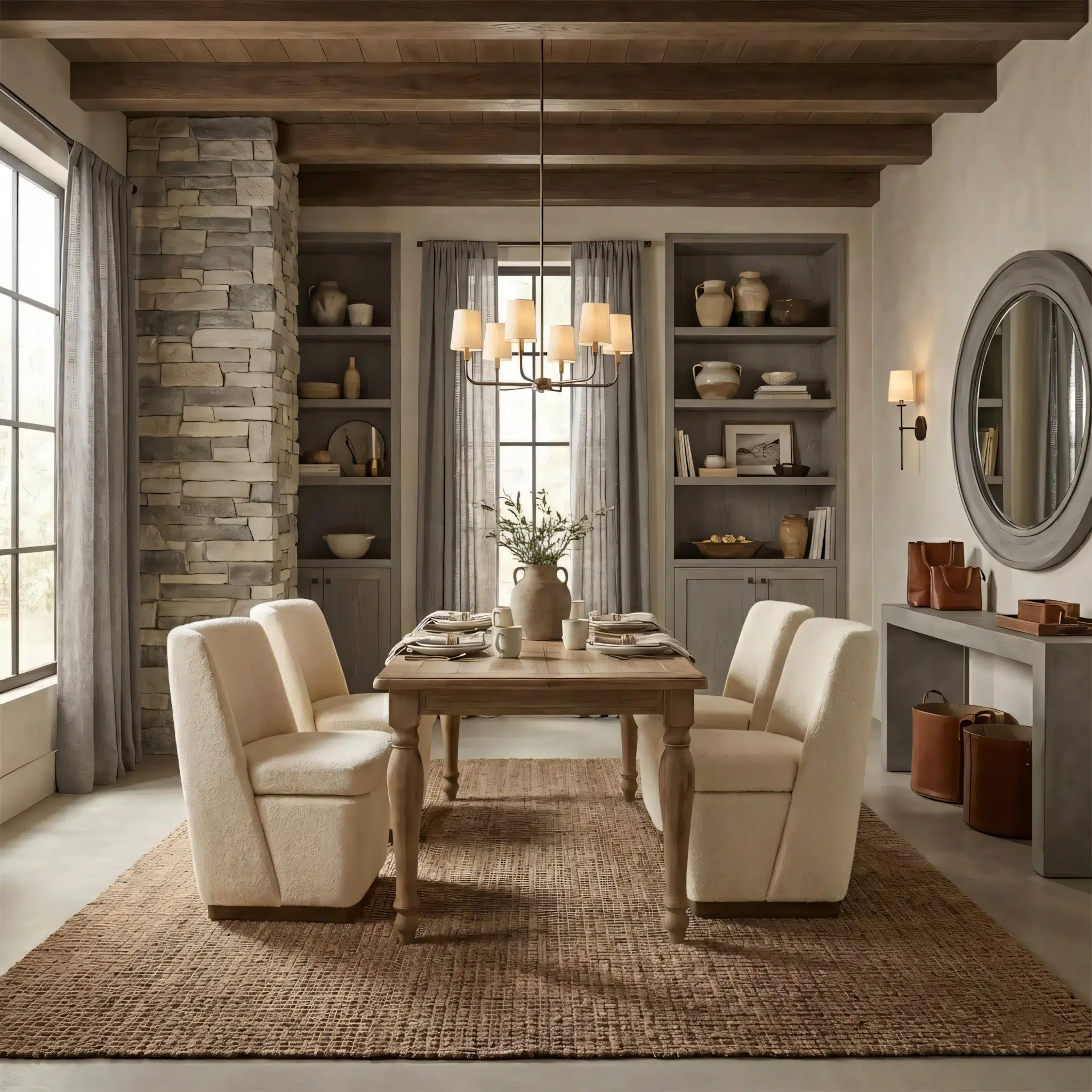 Moreover, the natural wooden tabletop introduces warmth and organic texture to the dining room. The sturdy table construction provides reliable support while maintaining a classic architectural form. The upholstered chairs complement the wooden table and offer comfortable seating, which makes the dining experience relaxed and inviting.