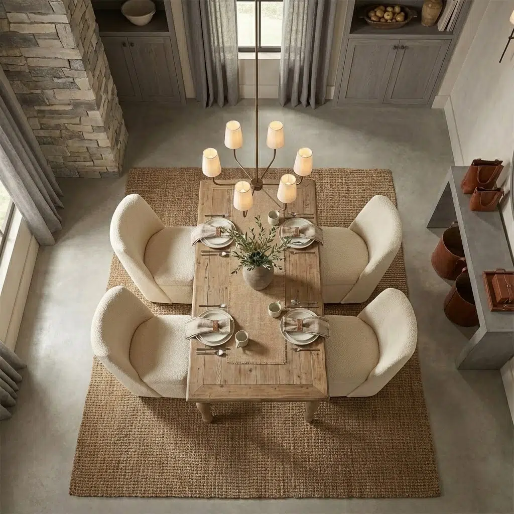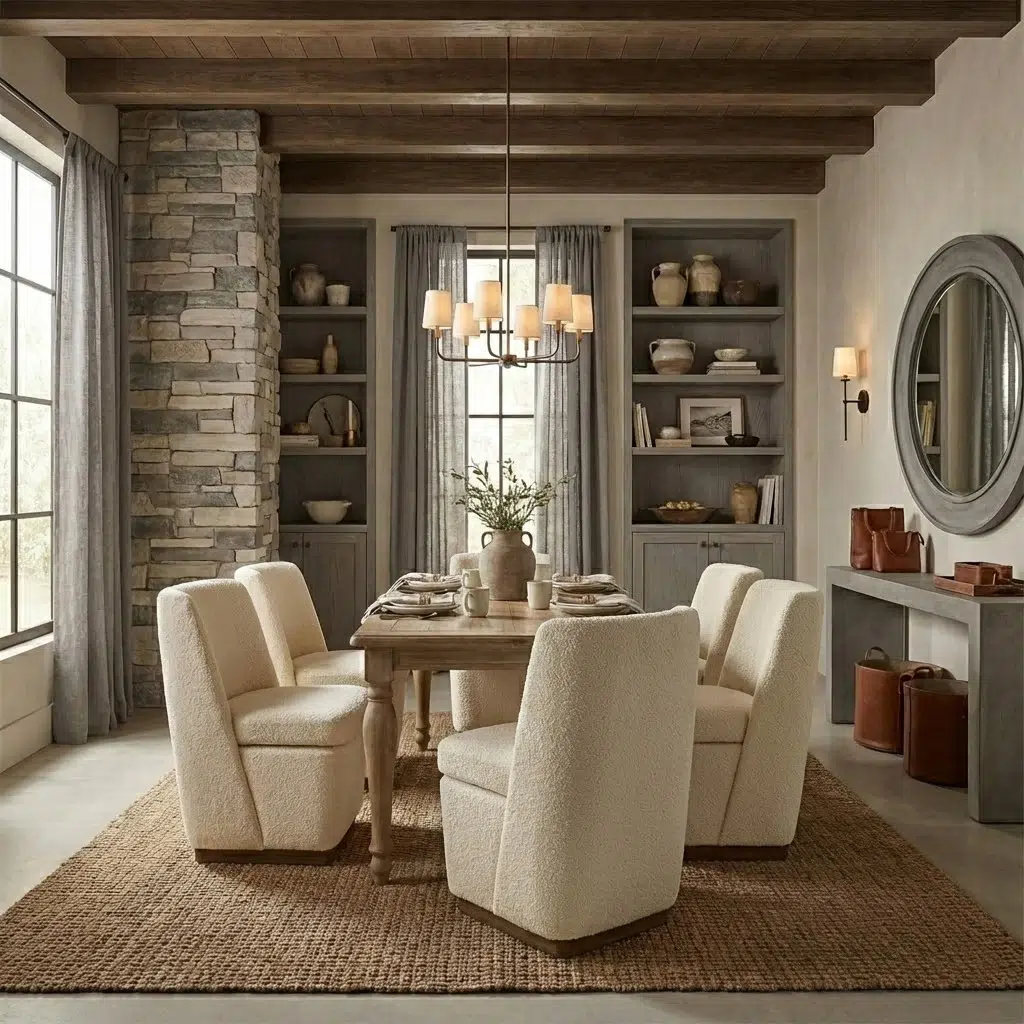 Additionally, the neutral color palette allows the dining set to integrate easily into contemporary interiors. The soft fabric chairs add visual softness while maintaining a balanced and elegant dining arrangement. Meanwhile, the spacious tabletop offers enough room for dining settings, serving dishes, and daily use.