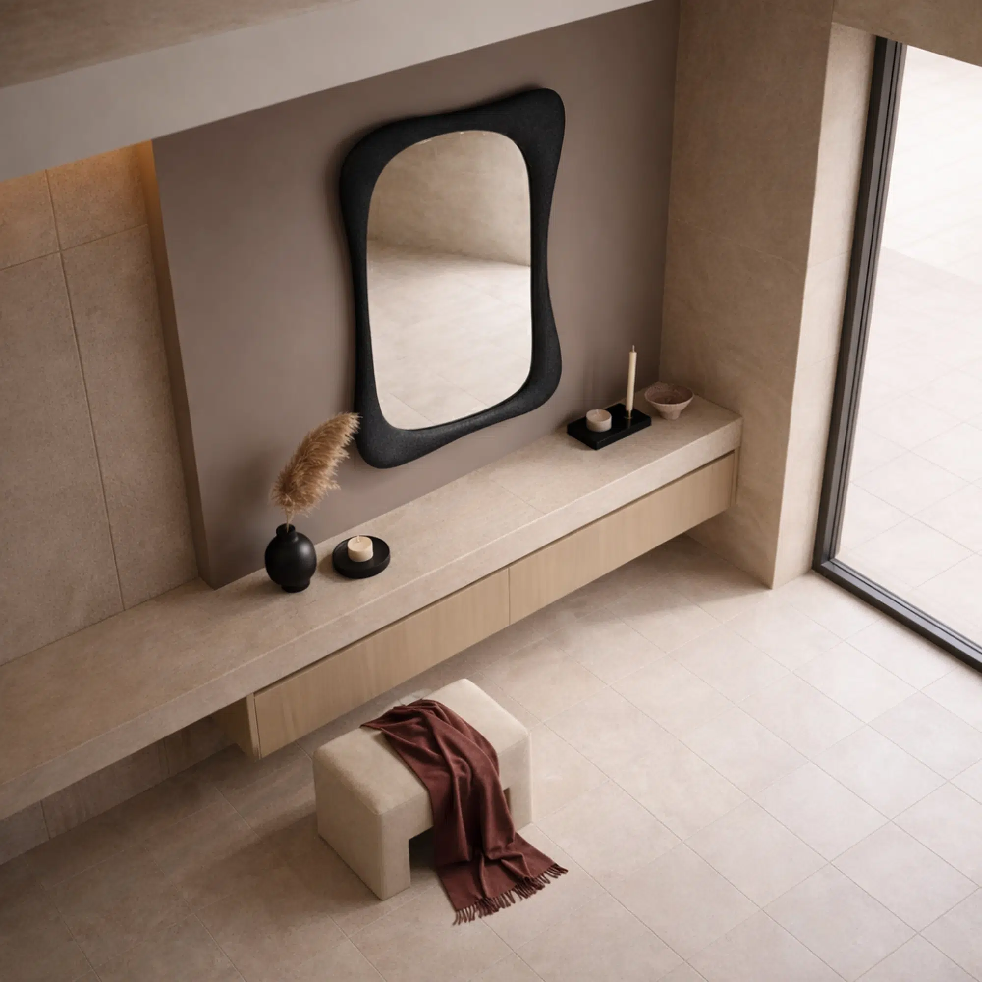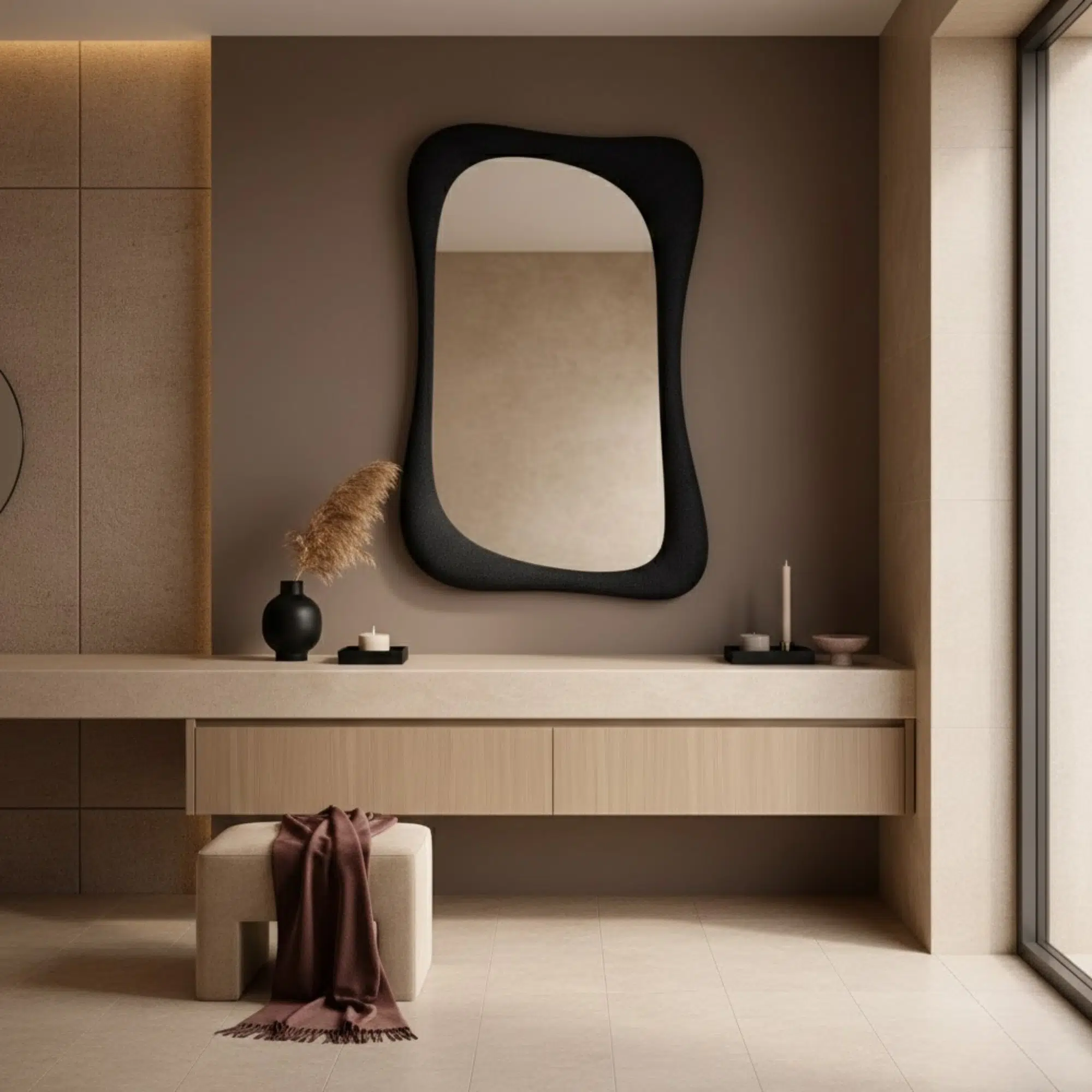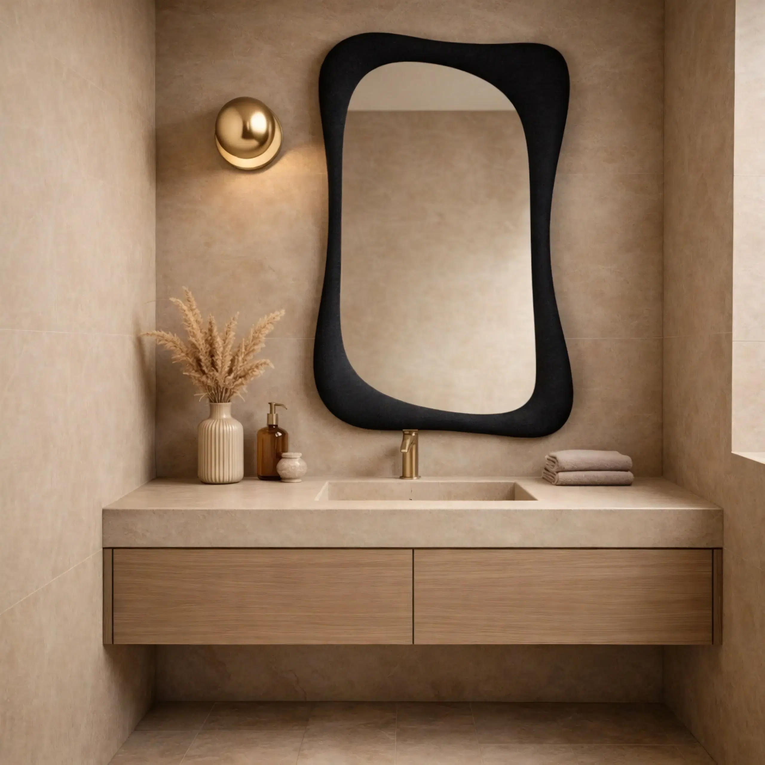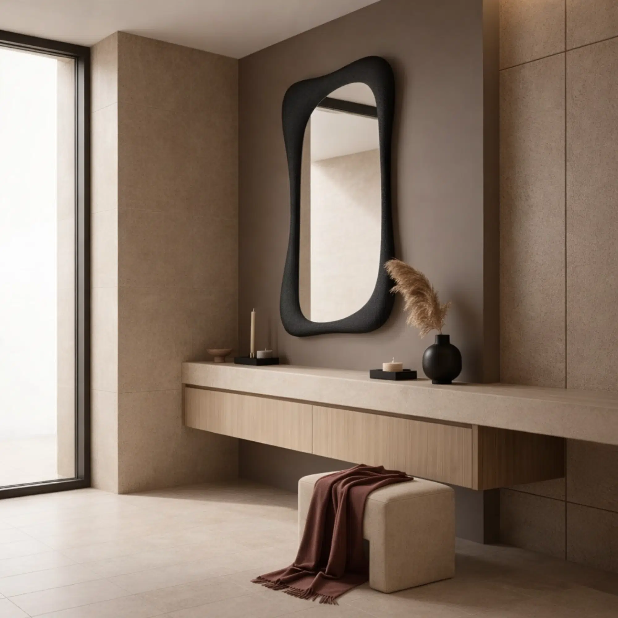 Meanwhile, the organic frame shape softens straight architectural lines. Moreover, this detail adds warmth while keeping a refined appearance. Consequently, the mirror pairs well with modern vanities and neutral finishes. As a result, it supports cohesive and balanced interior layouts.
