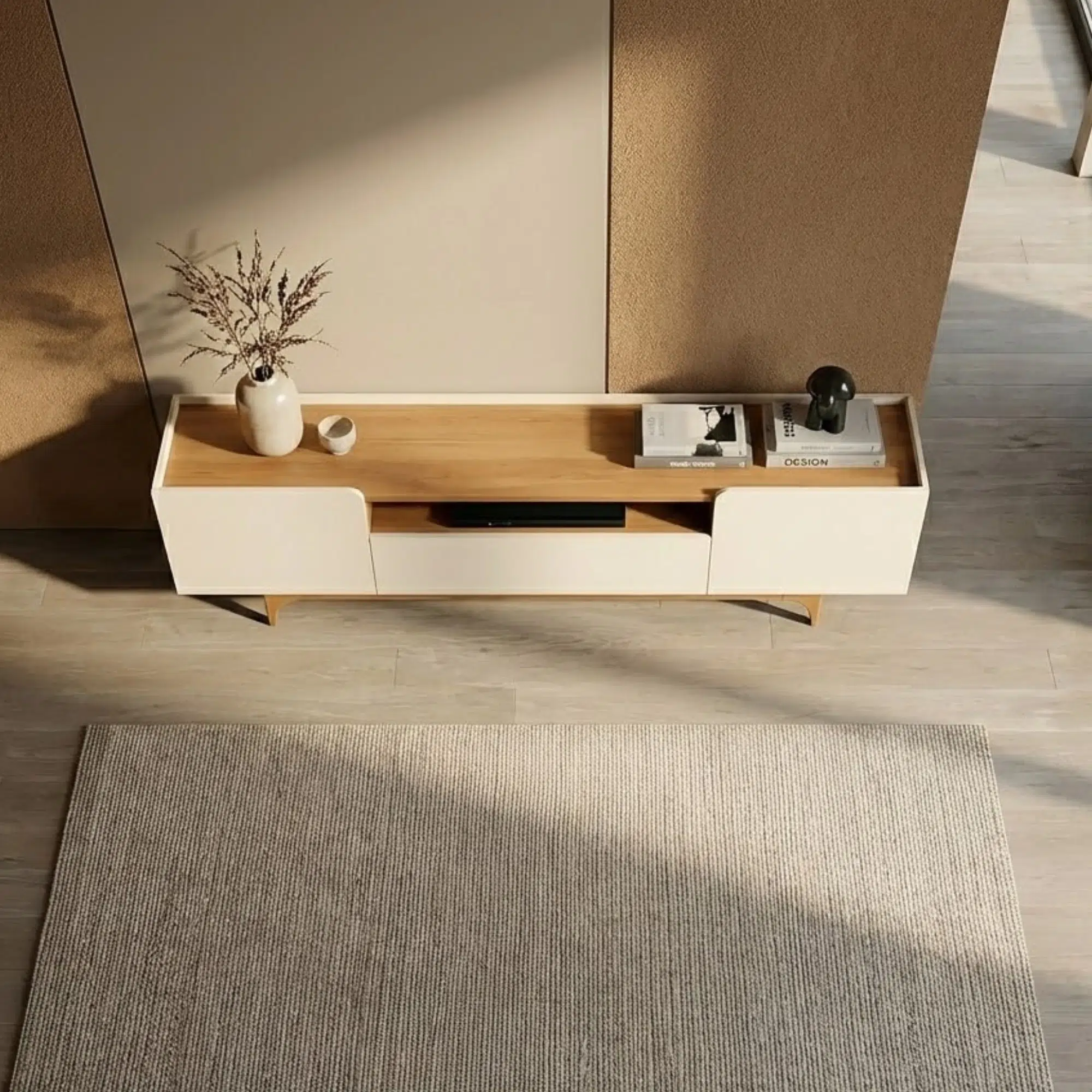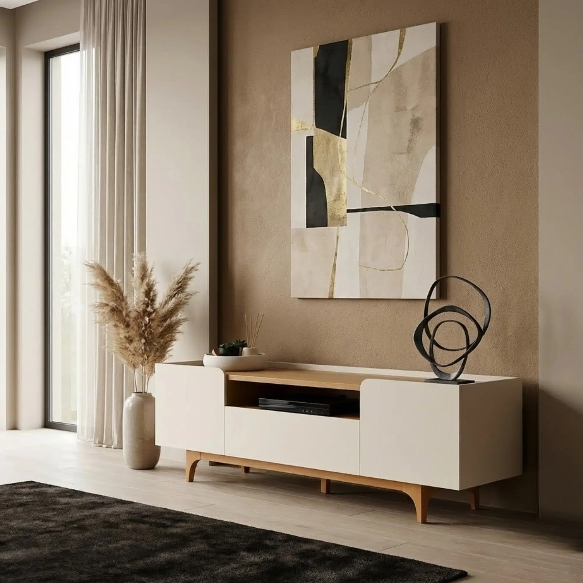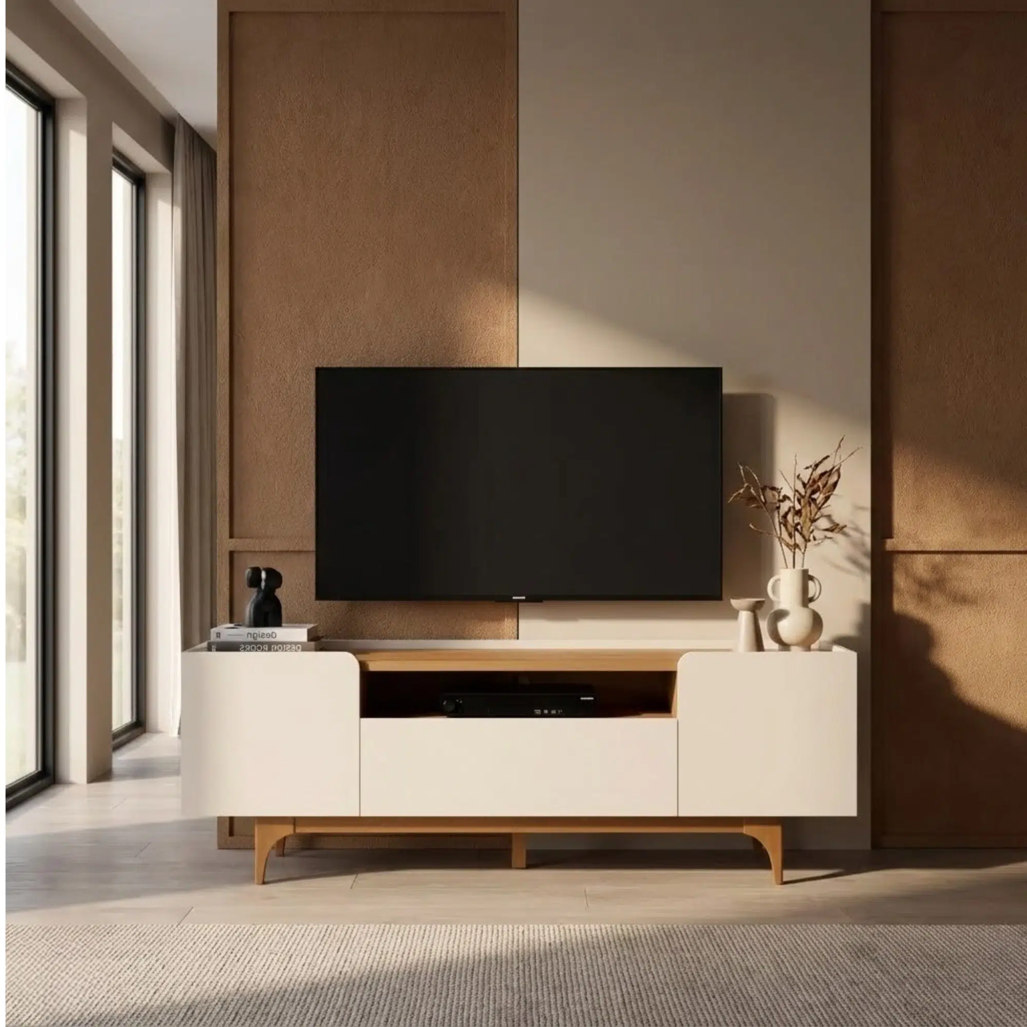 Built to support TVs up to 75 inches, this media unit Dubai features three closed doors to neatly hide cables, routers, and accessories, while the open shelf is perfect for soundbars or media players. Its balanced proportions make it ideal for apartments, villas, and open-plan living rooms across Dubai and Abu Dhabi.