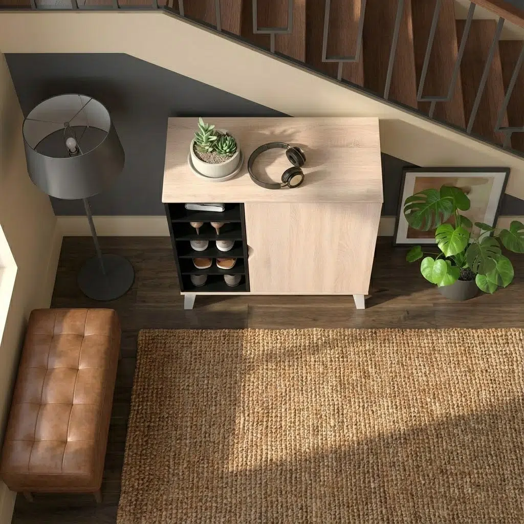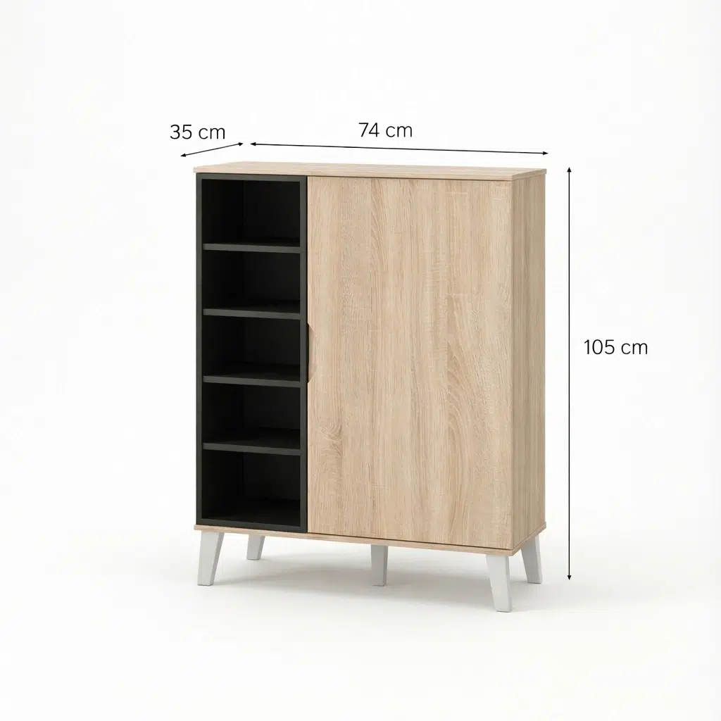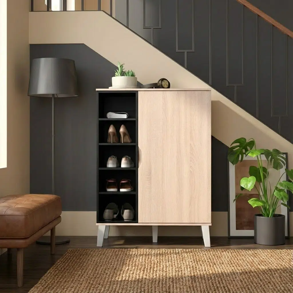 Additionally, this shoe storage cabinet suits modern UAE homes perfectly. Therefore, it improves entryway shoe storage by keeping frequently worn footwear within easy reach. Its two-tone finish and angled legs add subtle character. Consequently, it blends beautifully with contemporary interiors.