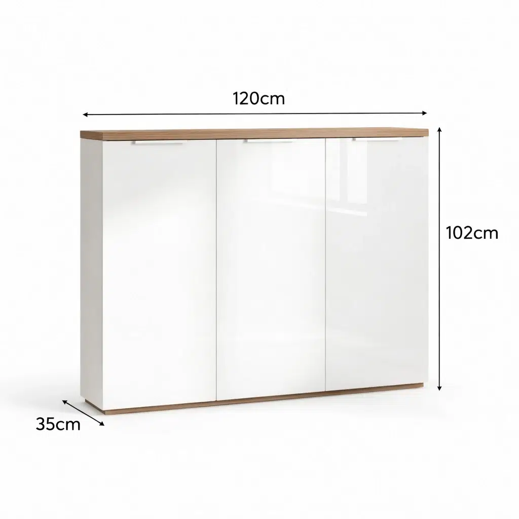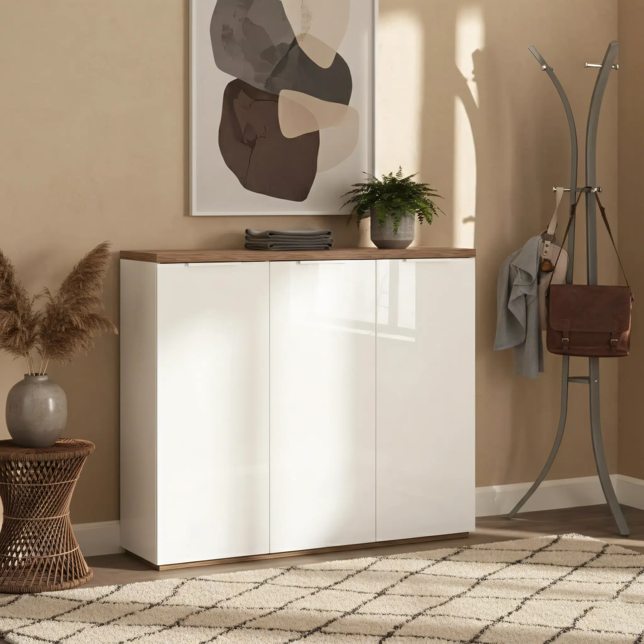 Furthermore, the cabinet is crafted with durable materials for everyday use. Thus, it provides reliable strength and stability. The three-door design keeps shoes concealed. As a result, visual clutter is reduced and the space stays tidy.