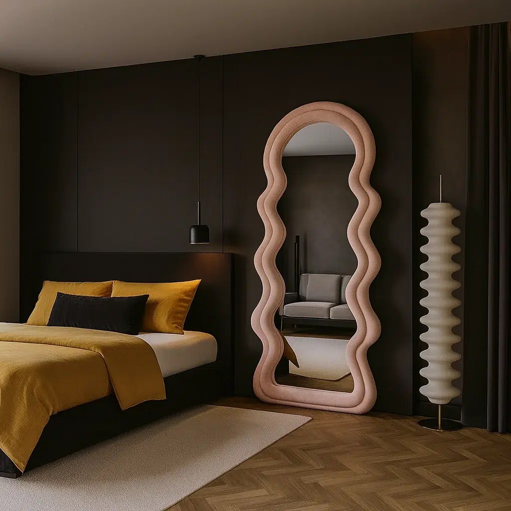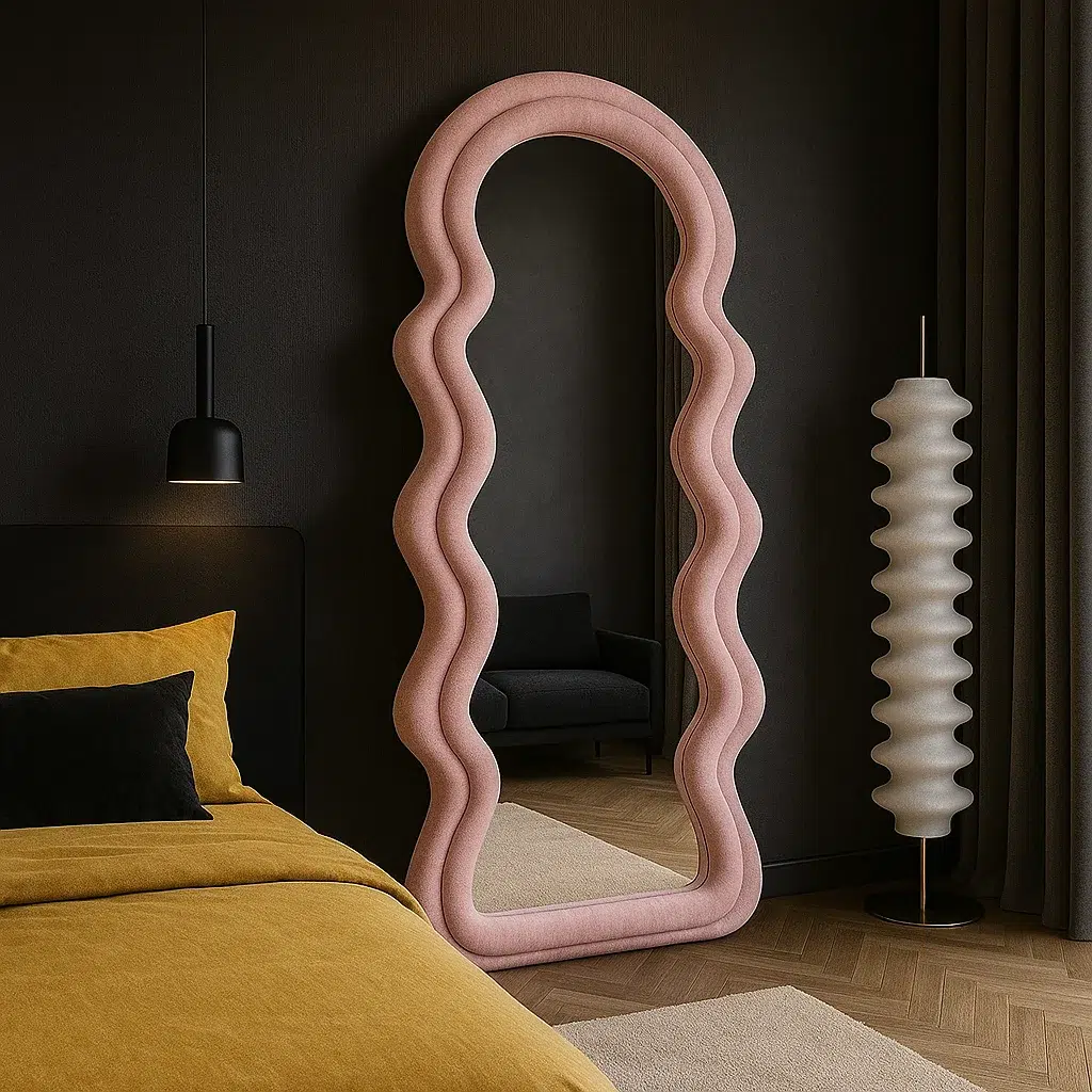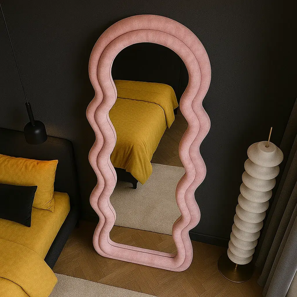 Add a touch of luxury to your space with the Wavy Pink Frame Velvet Floor Mirror. Designed with an elegant arch top and soft wavy edges, this full-length mirror stands out as a statement piece in any room. The smooth pink velvet frame and high-quality glass reflect light beautifully, enhancing both warmth and depth in your décor. Crafted from durable wood and velvet, it blends modern style with timeless charm — perfect for bedrooms, dressing areas, or living rooms. Elevate your interior with this chic 180×80 cm mirror that radiates elegance and sophistication.