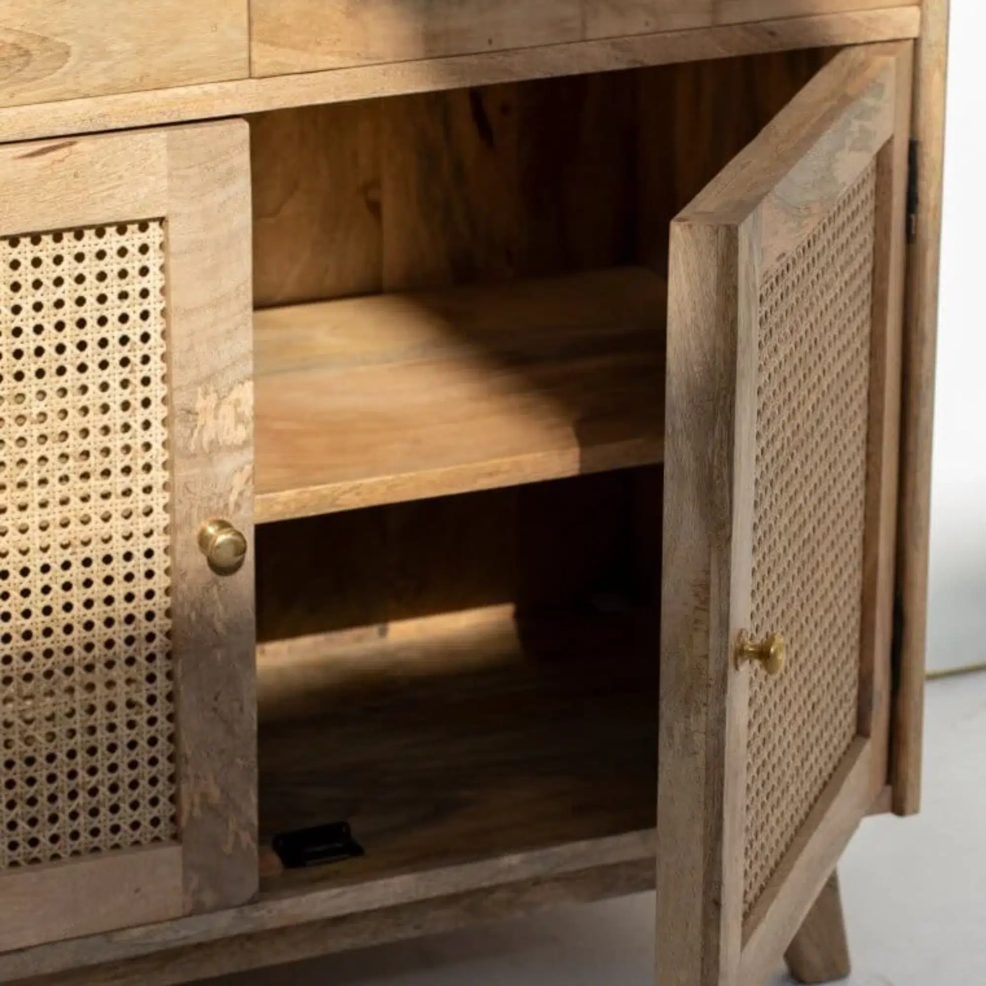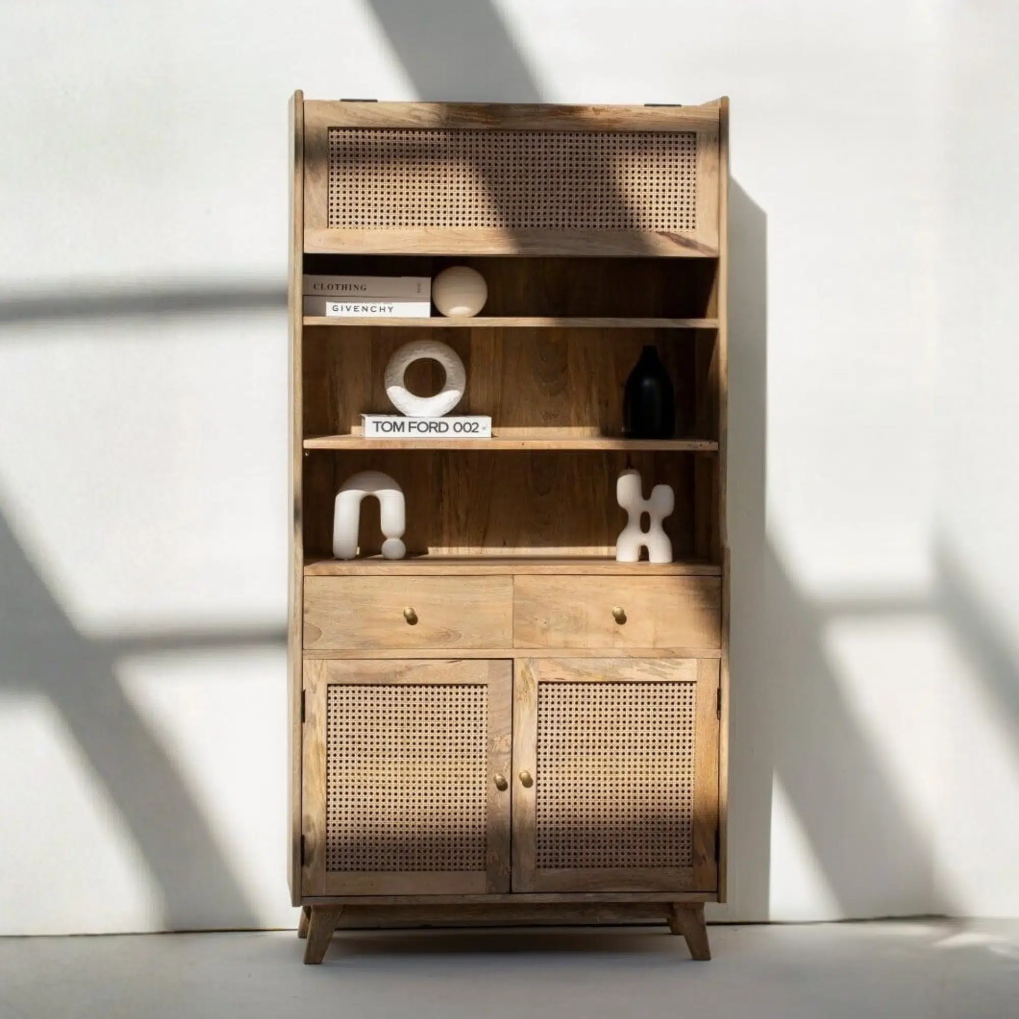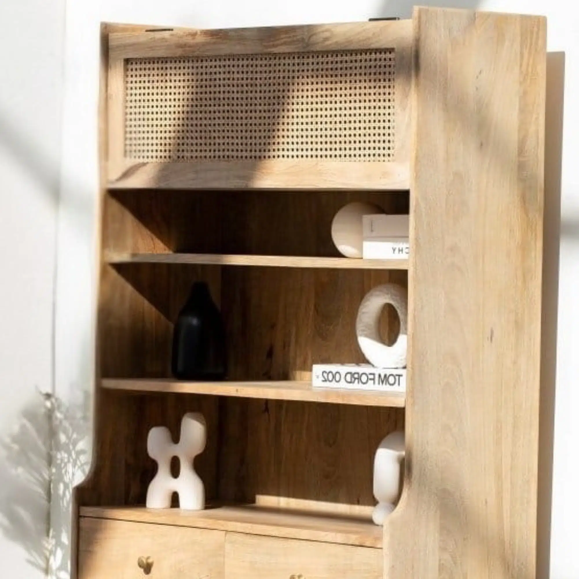 Overall, the Zanvera Display Cabinet is designed to bring bohemian elegance and contemporary structure into modern interiors. Moreover, its harmonious blend of natural materials creates a warm and inviting presence that enhances living spaces with subtle character.