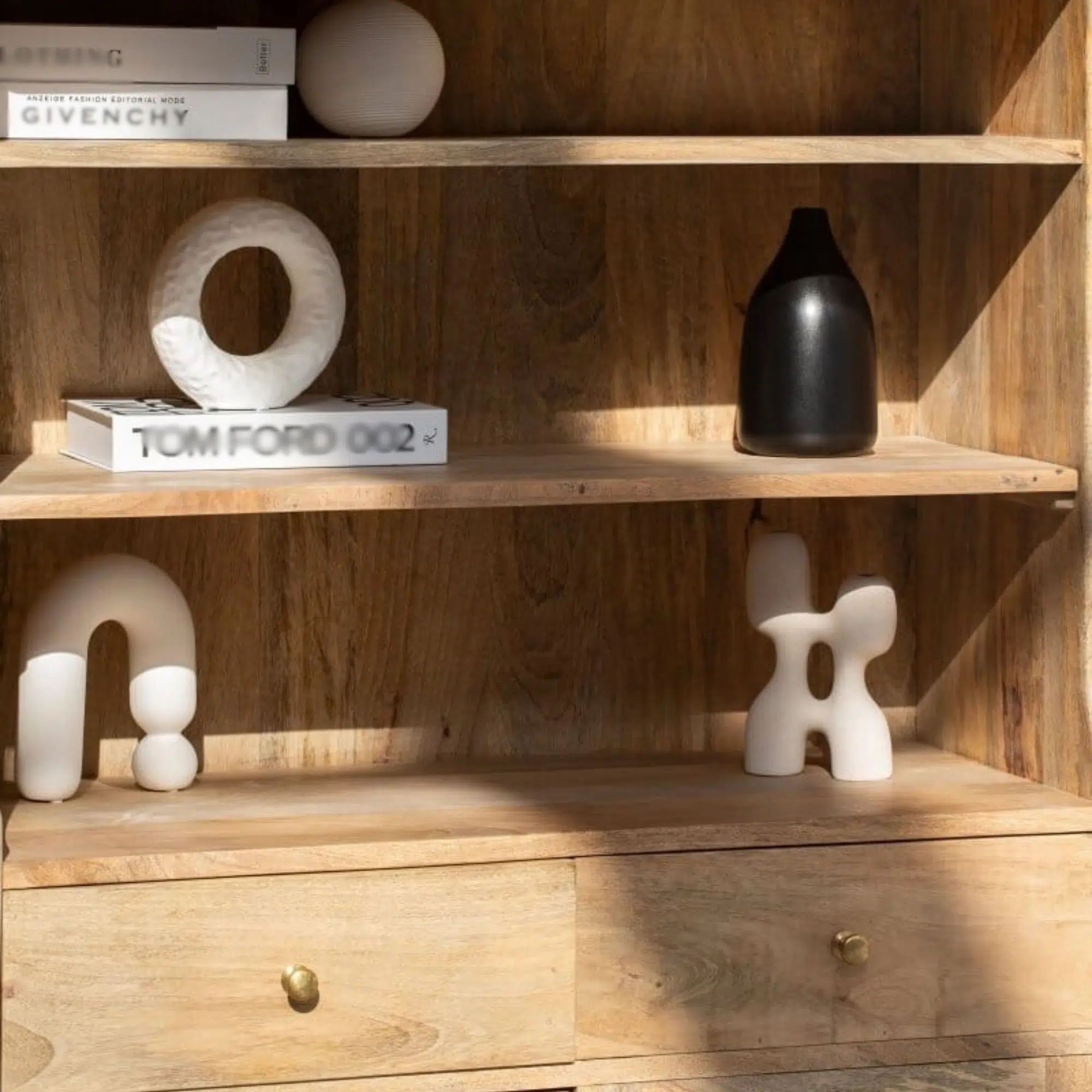 Additionally, the cabinet offers a balanced combination of display and storage through its bookcase-style form. Meanwhile, the vertical proportions allow it to serve as a refined focal piece without occupying excessive floor space. Consequently, it supports organized styling while maintaining a calm and natural aesthetic.