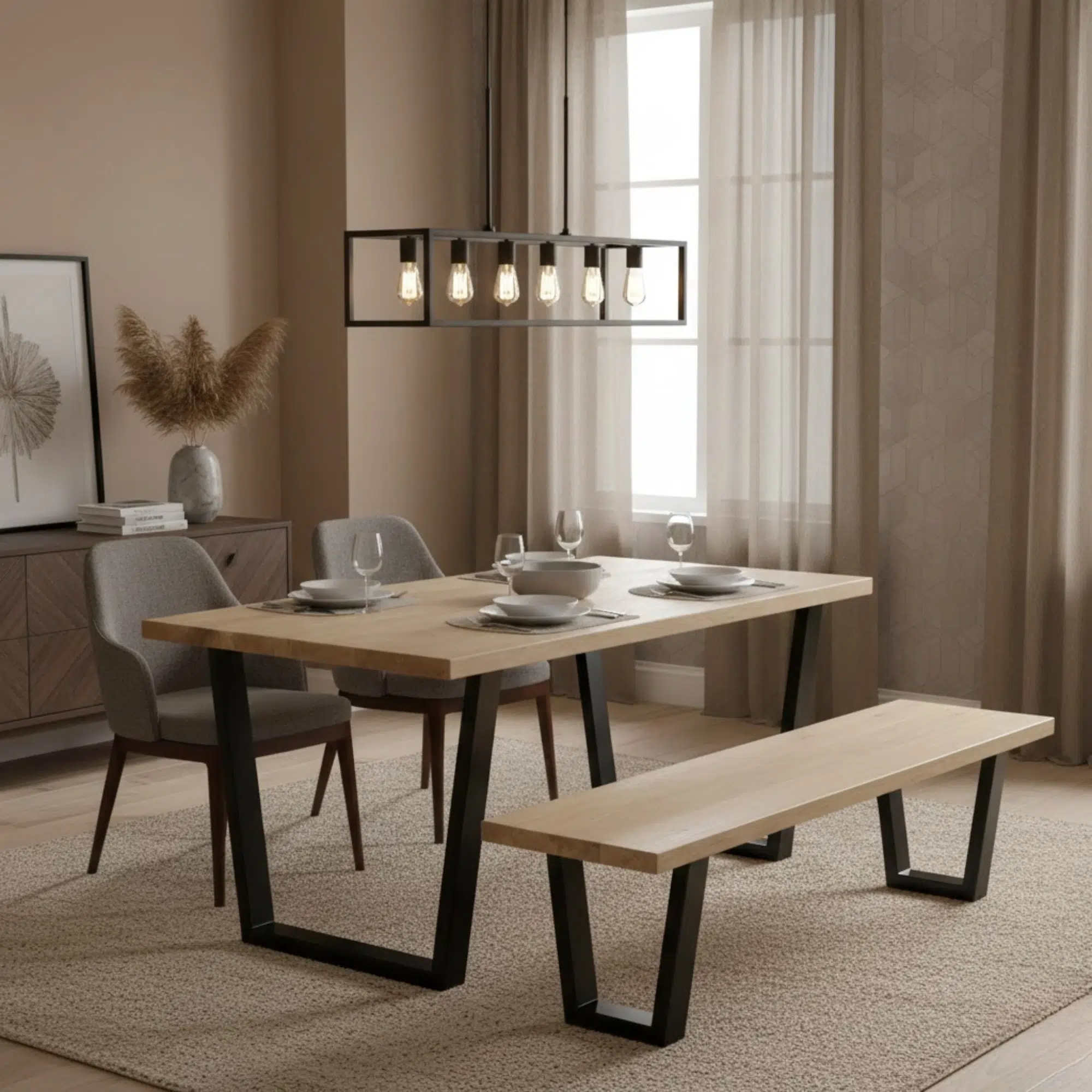 Additionally, the full-length wooden bench increases seating flexibility and complements the overall dining arrangement. The bench aligns with the table design to maintain a cohesive and minimal interior look. Meanwhile, the upholstered dining chairs add comfort and soften the contrast between the metal frame and wooden tabletop.