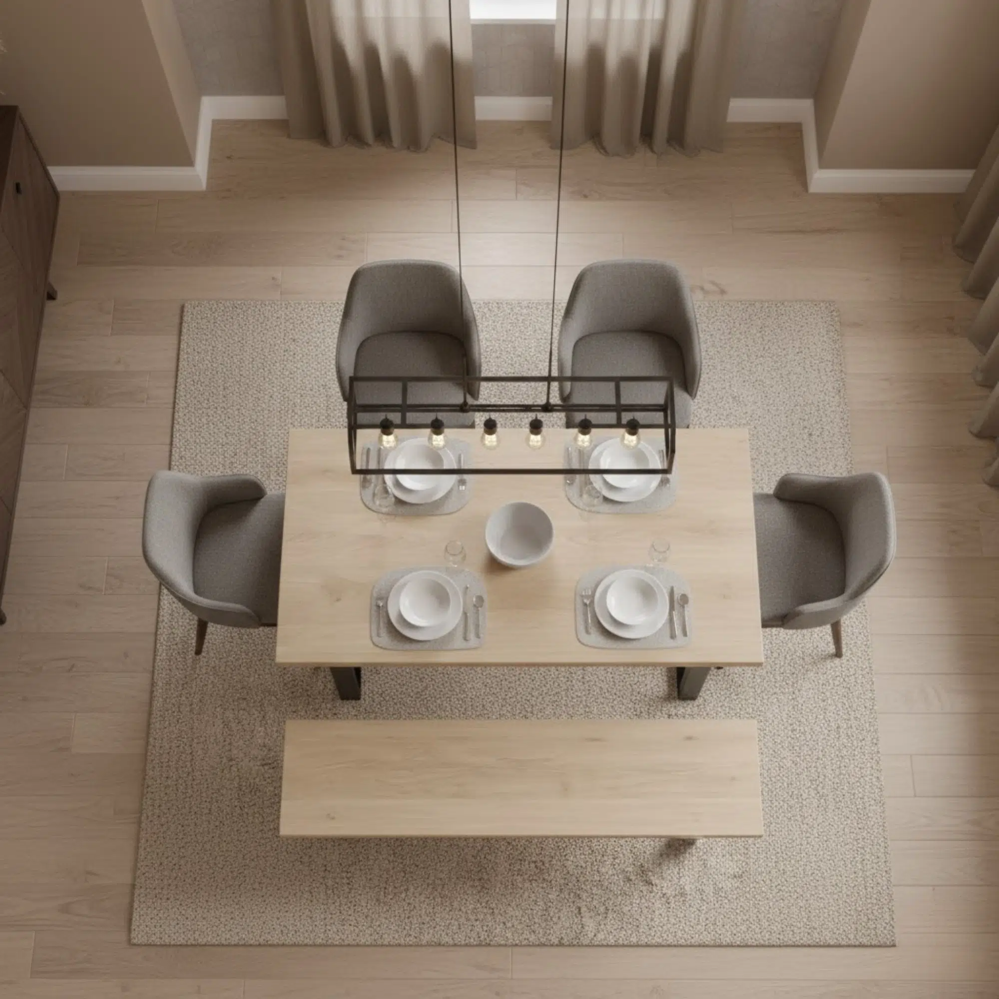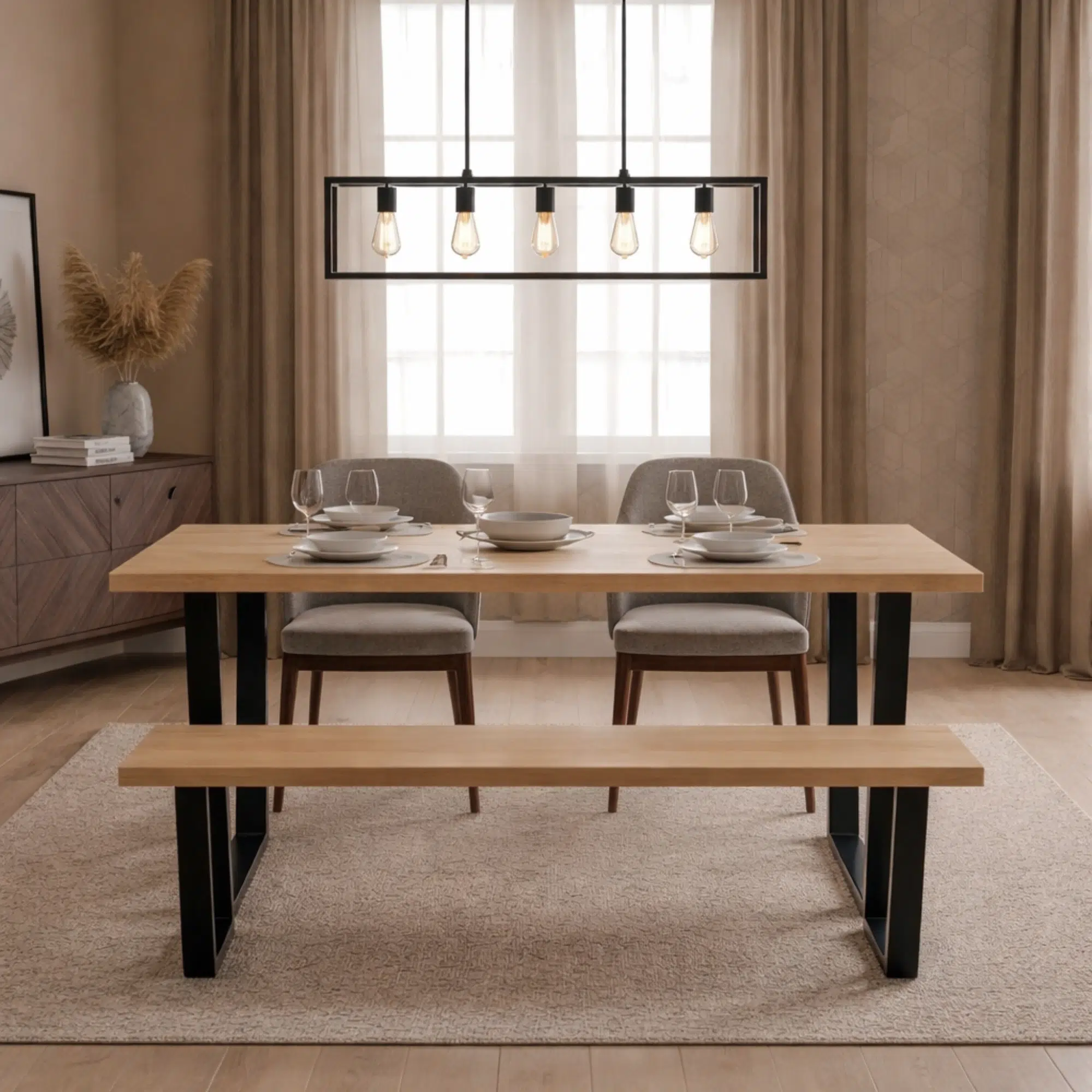 Overall, the Wooden Dining Table Set With Bench and Chairs creates a modern and balanced dining environment for contemporary homes. The design features a rectangular wooden tabletop supported by a structured metal frame, paired with a matching wooden bench and upholstered dining chairs. This arrangement provides a clean and organized dining layout suitable for everyday meals and casual gatherings.