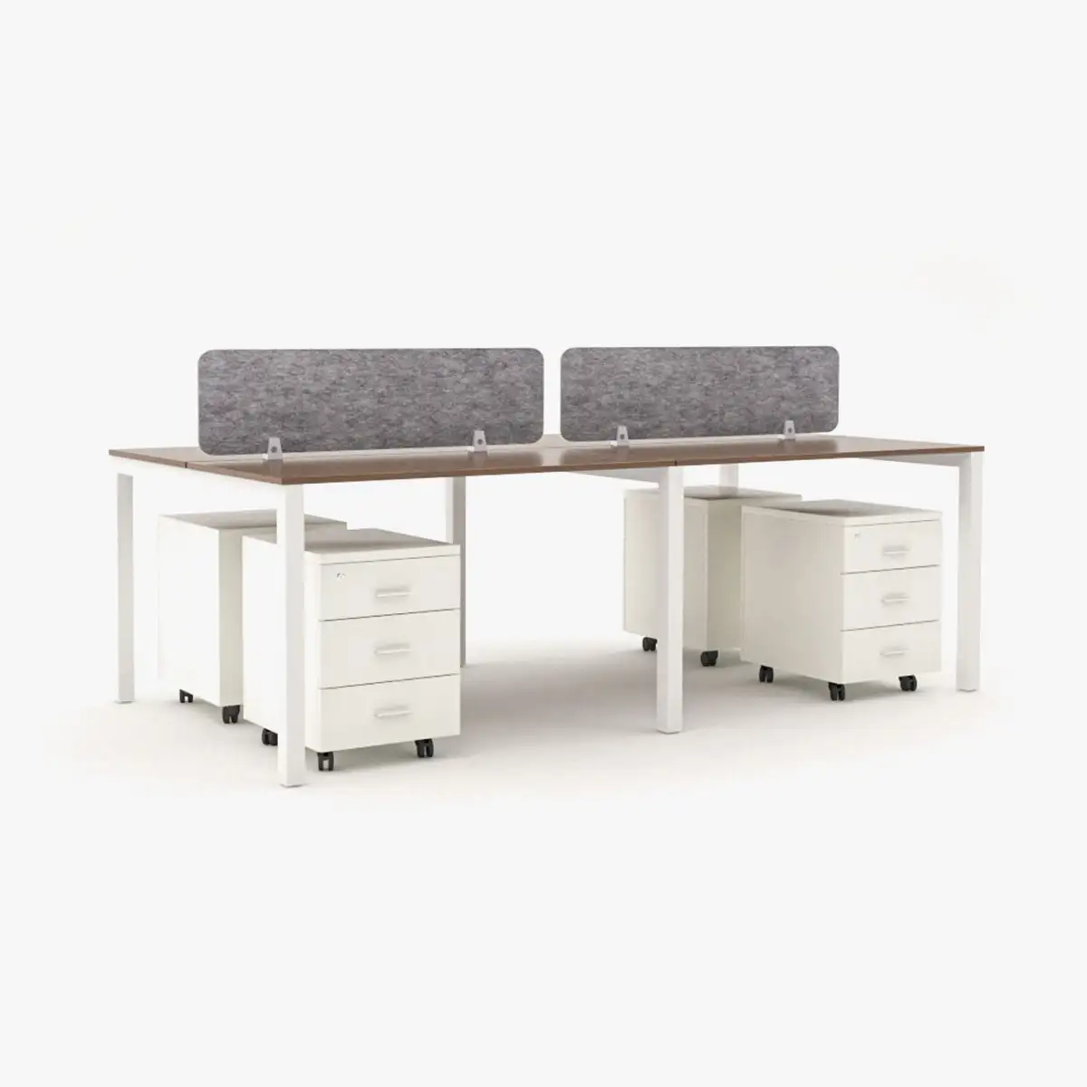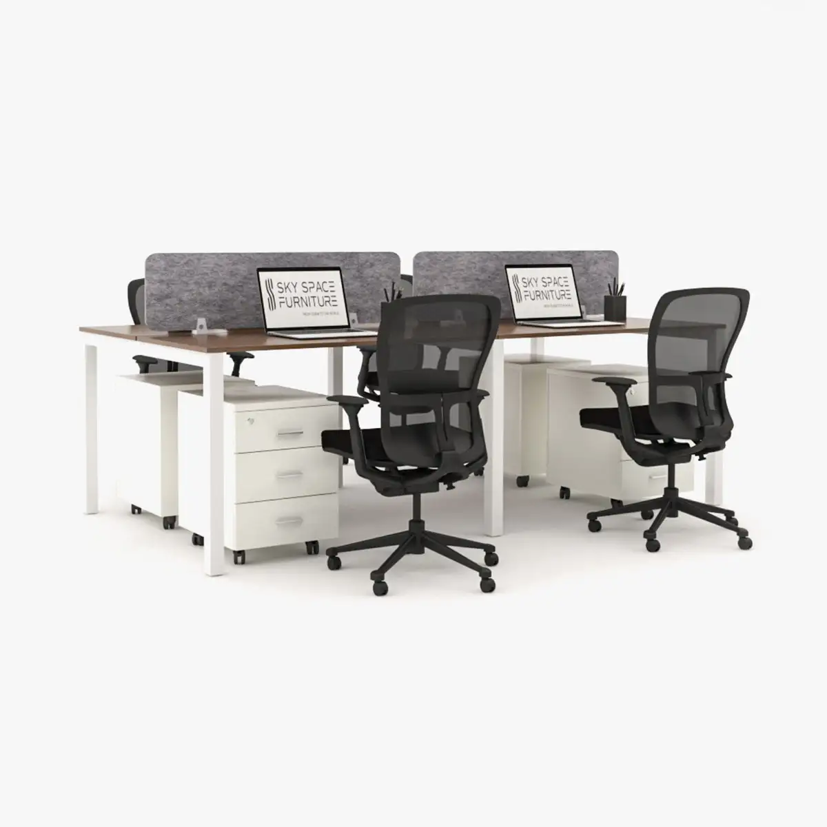 Karnak offers the Swift series face to face workstation cluster of 4 people with minimalist design. Get a bespoke stylish face to face workstation cluster of 4 with fully connected corner steel frame base. Above all, this modern collaborative office furniture comes with customizable screen panels and board finishes as of Karnak Material . Every desks is allocated a special storage cabinet and cable management round grommets to keep the workspace organized. When it comes to workplace safety