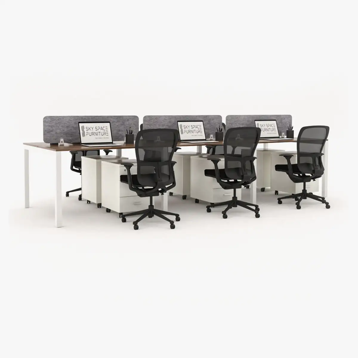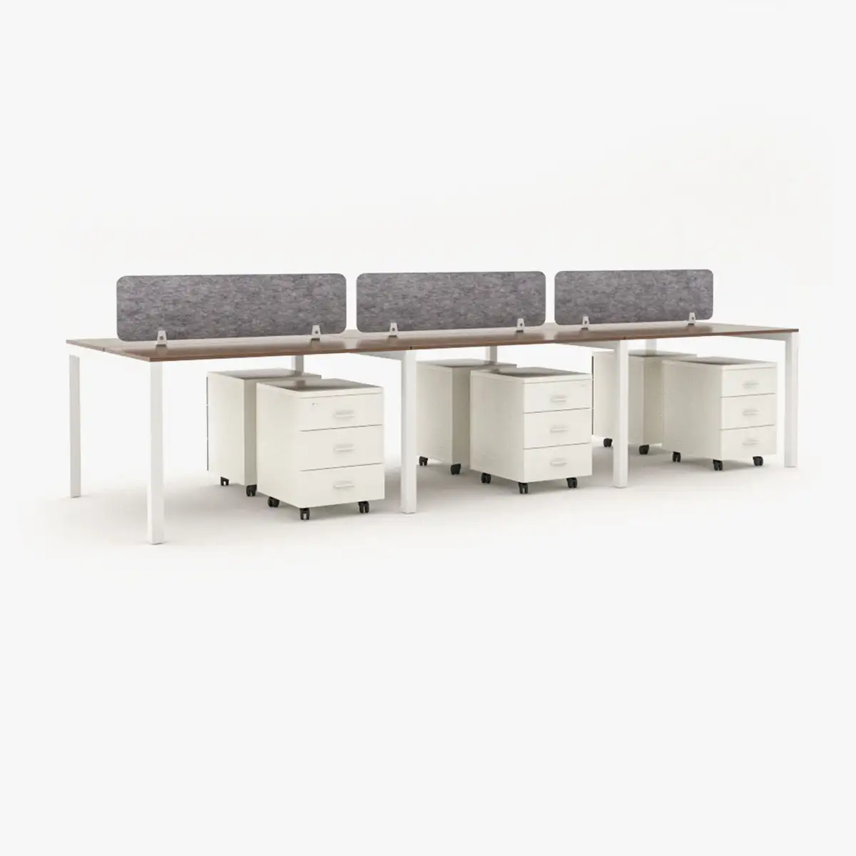 Karnak offers the Swift series face to face workstation cluster of 6 people with minimalist design. Get a bespoke stylish face to face workstation cluster of 6 with fully connected corner steel frame base. Above all, this modern collaborative office furniture comes with customizable screen panels and board finishes as of Karnak Material . Every desks is allocated a special storage cabinet and cable management round grommets to keep the workspace organized. When it comes to workplace safety